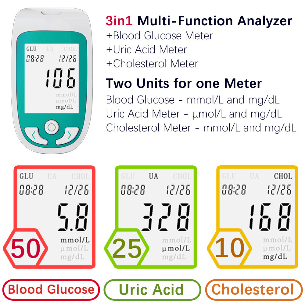 - ✅ 3-in-1 Health Monitoring: Measures Blood Glucose (Glu), Uric Acid (UA), and Cholesterol (Cho) – ideal for diabetics, gout patients, pregnant women, and health-conscious individuals.