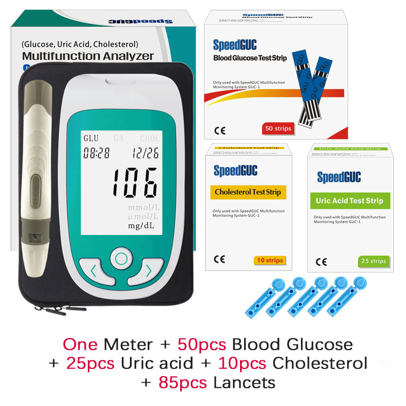 | ① Glu50UA25Cho10 | 3-in-1 Meter + 50 Glucose Strips + 25 Uric Acid Strips + 10 Cholesterol Strips + Lancing Device + Lancets |