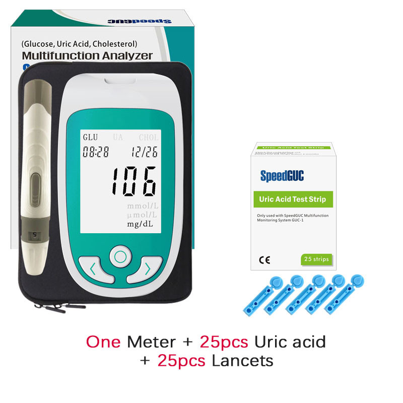 | ② UA25Cho10 | 3-in-1 Meter + 25 Uric Acid Strips + 10 Cholesterol Strips + Lancing Device + Lancets |