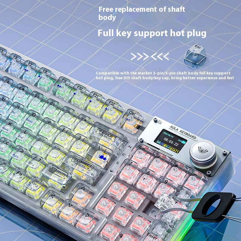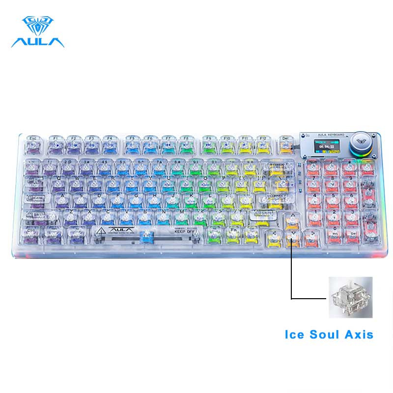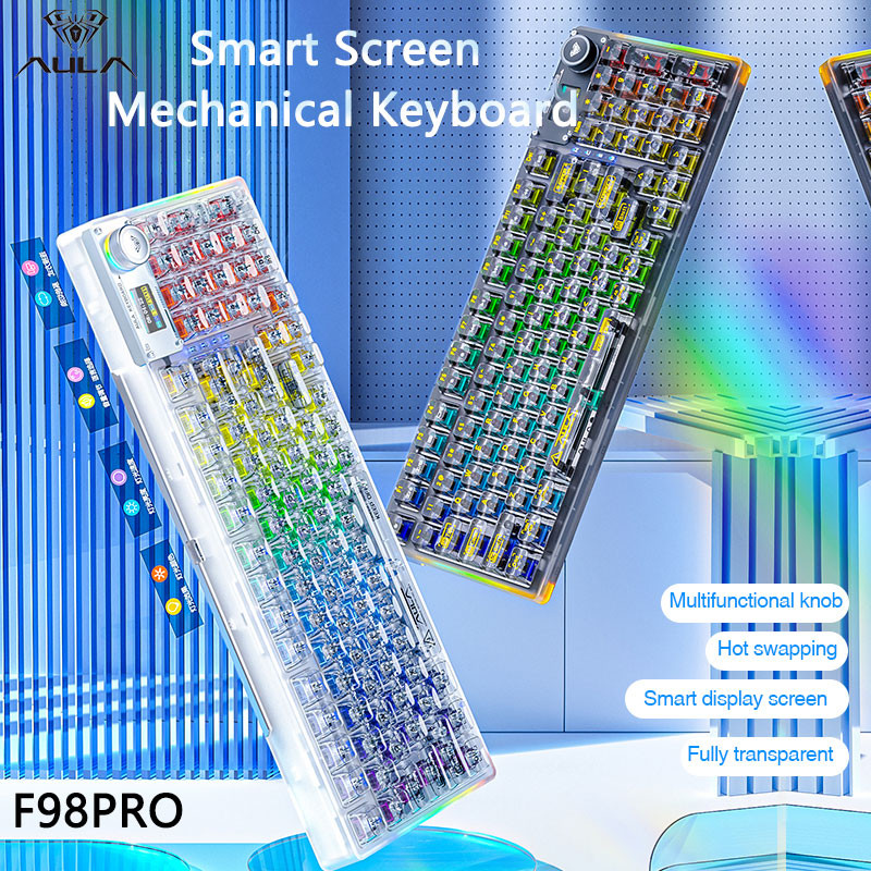 Elevate your gaming setup with the futuristic AULA F98PRO — a wireless mechanical keyboard packed with custom RGB, clear keycaps, a built-in screen, and pro-level performance. Game in style and dominate with precision.
