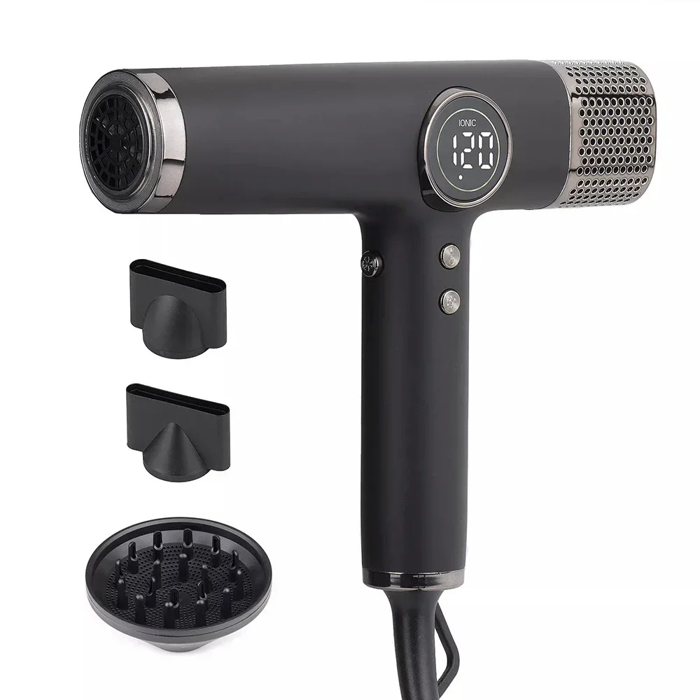 Features four precise heat settings (natural temperature, fifty-seven degrees, eighty degrees, one hundred ten degrees Celsius), three speed settings (high, medium, low), and a dedicated cool button. Suitable for all hair types and a range of styling needs.LED Display: