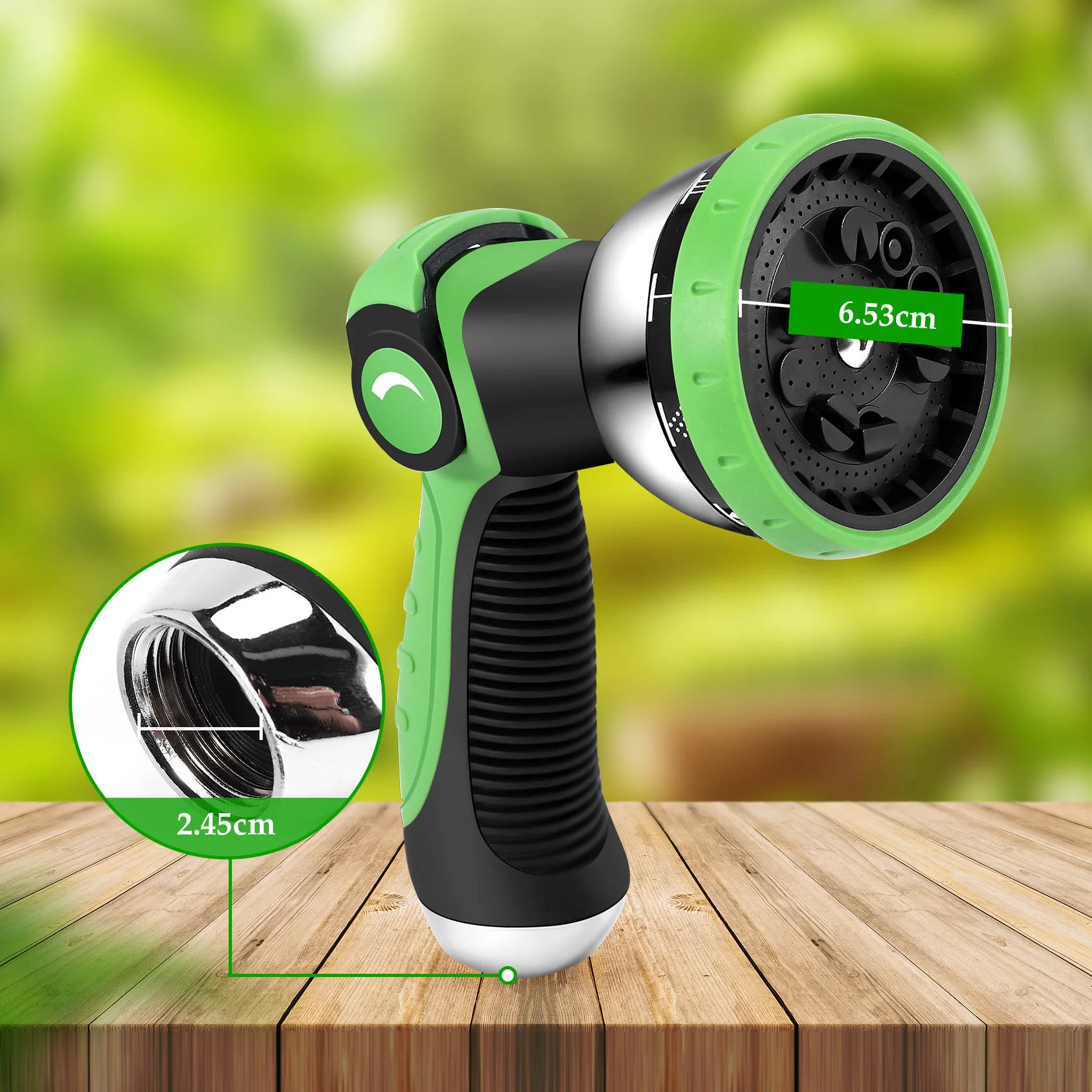 Adjustable spray gun with 10 patterns: mist, shower, jet, cone, flat, full, soaker, and more.