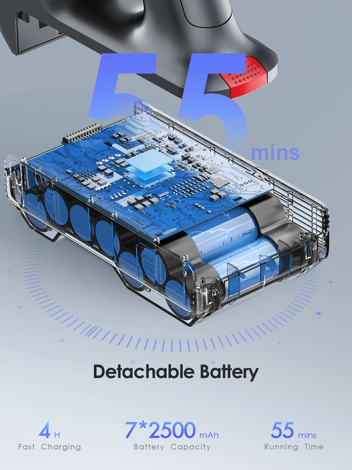Equipped with a 7×2500mAh Li-ion battery, enjoy up to 55 minutes of uninterrupted cleaning. Charges in 4–5 hours with smart battery protection chip to extend battery life.Ultra Clear LED Display