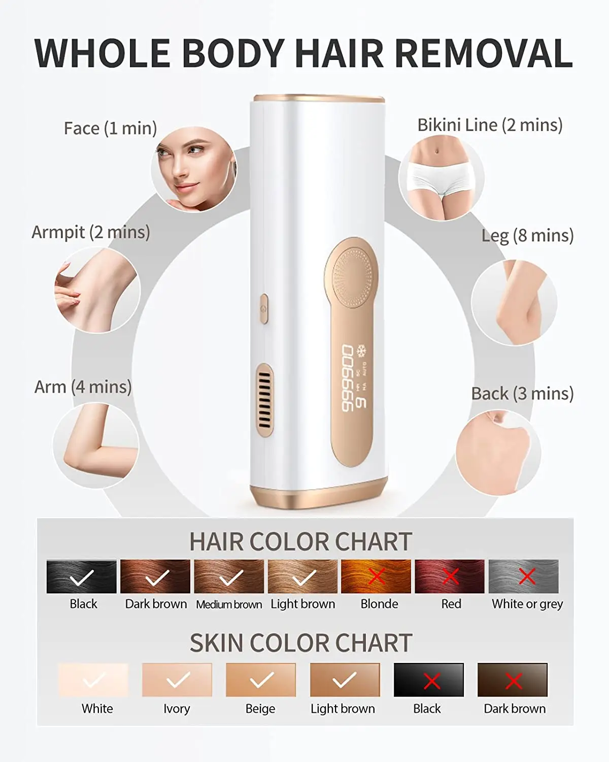 3 Skin Tone Sensors automatically adjust intensity for safety (not suitable for very dark skin).