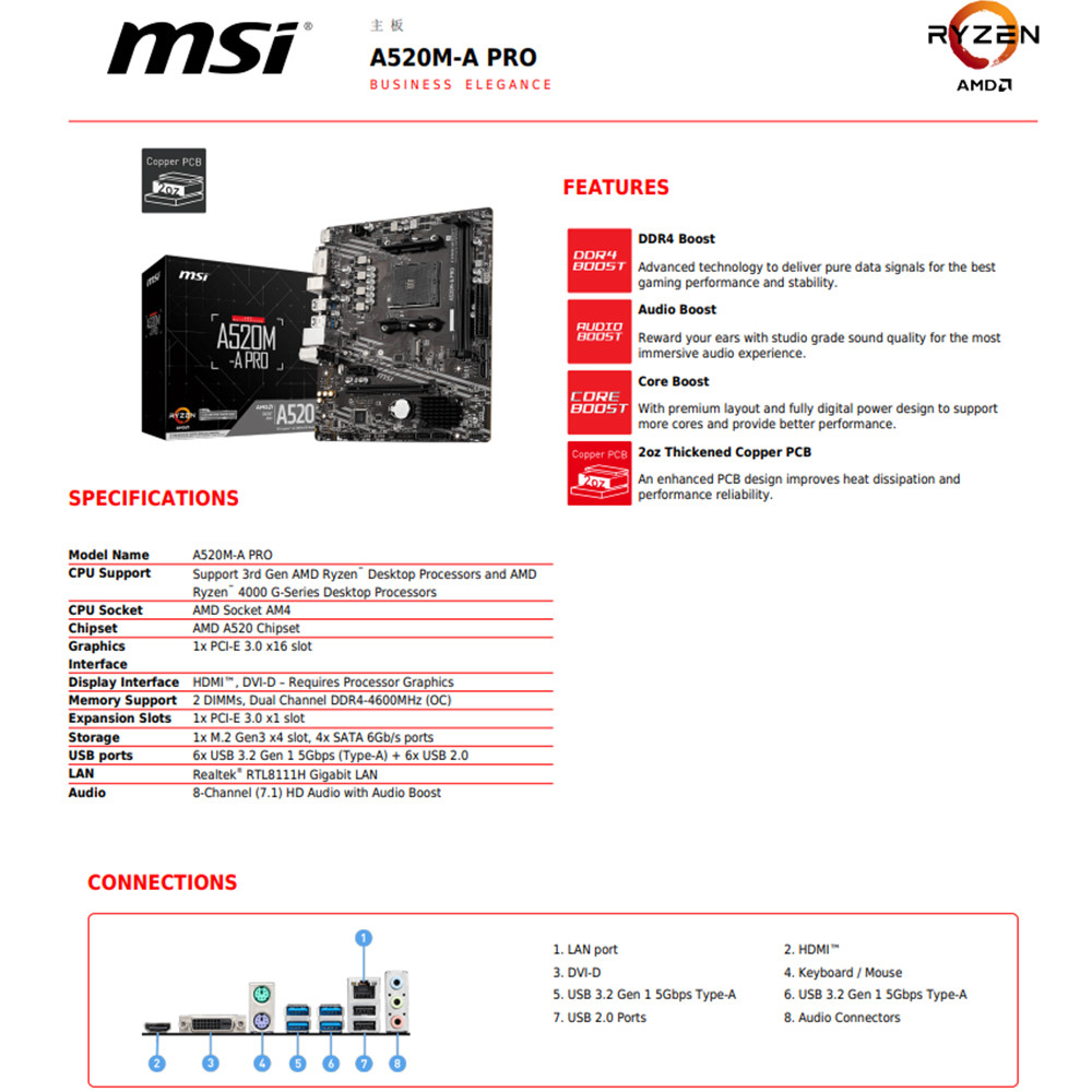 As a tech enthusiast, the MSI AMD A520M PRO Motherboard truly delivers on its promises. When I upgraded to this board, the 3rd Gen AMD Ryzen™ Desktop Processor compatibility was a major plus. The speedy DDR4 Boost support and excellent connectivity options meant I could build a high performing system for all my gaming needs. Overall, a reliable choice for those looking for a future proof setup. 4 out of 5 stars for sure.