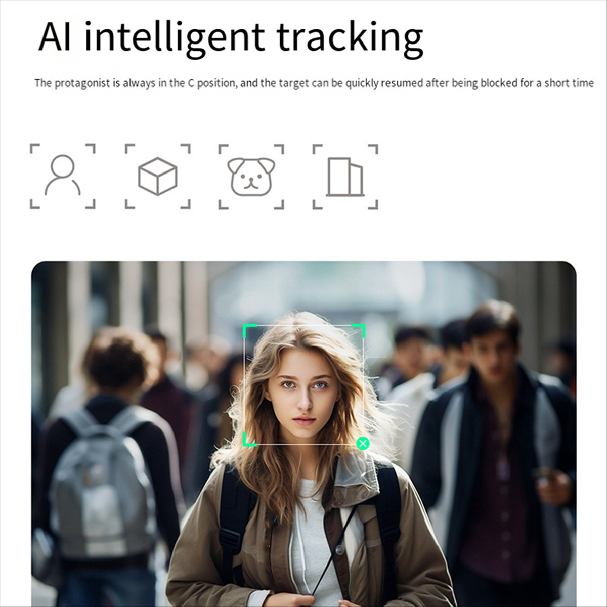 - Never lose focus! The AI-powered tracking system ensures your subject stays in frame, even if momentarily obscured. Perfect for dynamic action shots and vlogs.