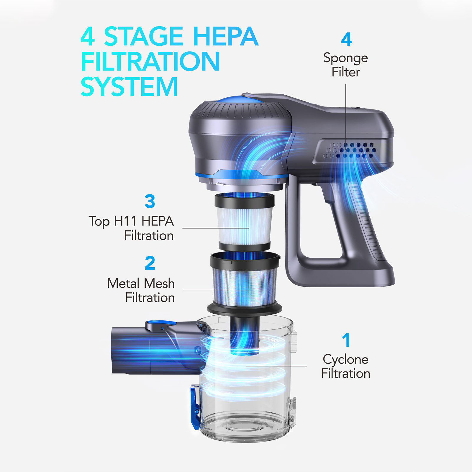 • Filtration System: 5-layer cyclone filtration