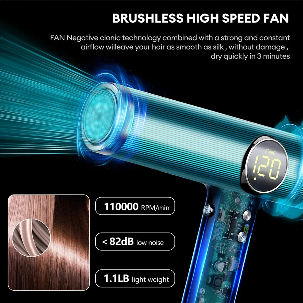 Powered by a state-of-the-art brushless DC motor with a speed of one hundred ten thousand revolutions per minute, delivering a robust wind speed of twenty metres per second. Enjoy up to five times faster drying, saving you valuable time on your hair routine.Advanced Hair Protection Technologies: