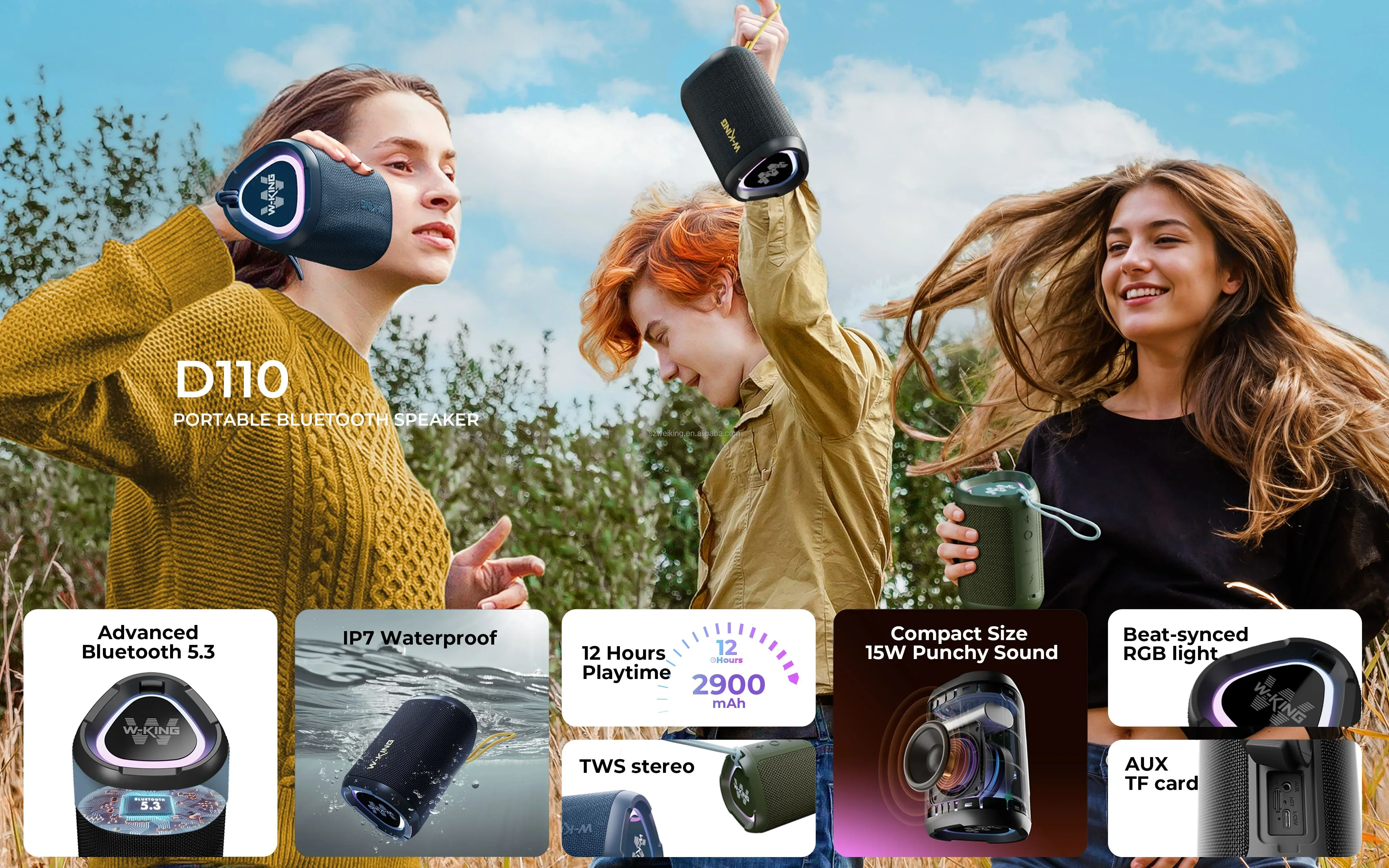W-KING D110 combines rugged design with impressive sound, making it a great companion for both indoor and outdoor adventures.